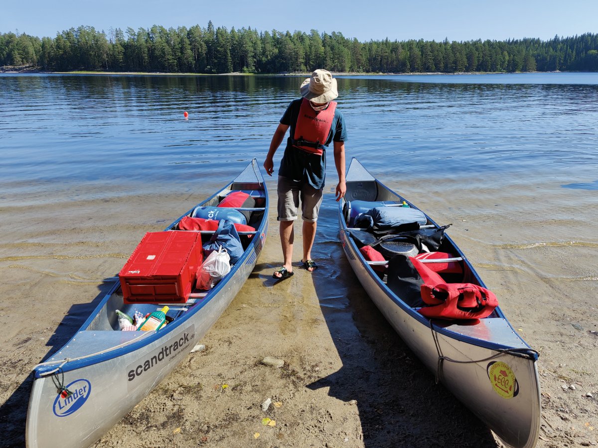 Nun war der Tag gekommen an dem wir nun endlich unsere Kanus bekommen sollten deswegen war es nur halb so schlimm, dass wir unsere Wecker auf 6:40 Uhr gestellt hatten. Nachdem wir ein kleines Frühstück an unserm Steg genossen haben ging es nun also in das Outdoorcamp Höglund wo unsere Kanutour richtig starten sollte. Im Camp angekommen trugen wir unser Gepäck auf die Wiese und begannen auszusortieren was wirklich mit musste. Da wir sehr früh dran waren ging es eine Weile bis wir einchecken konnten und unsere Ausrüstung abholen konnten aber, da wir sowieso noch etwas verschlafen waren konnte ein Kaffee auch nicht schaden. Als wir dann um 10 Uhr mit dem Check-In begannen, ging es auch nicht all zu lange bis wir unser Zeug in den Packsäcken verstauen konnten und wir uns zum Ufer aufmachten, wo wir eine Einweisung zum Kanu fahren bekommen haben. Zu diesem Zeitpunkt war die Vorfreude riesig und wir freuten uns sehr, nun endlich auf die Kanus gehen zu können.