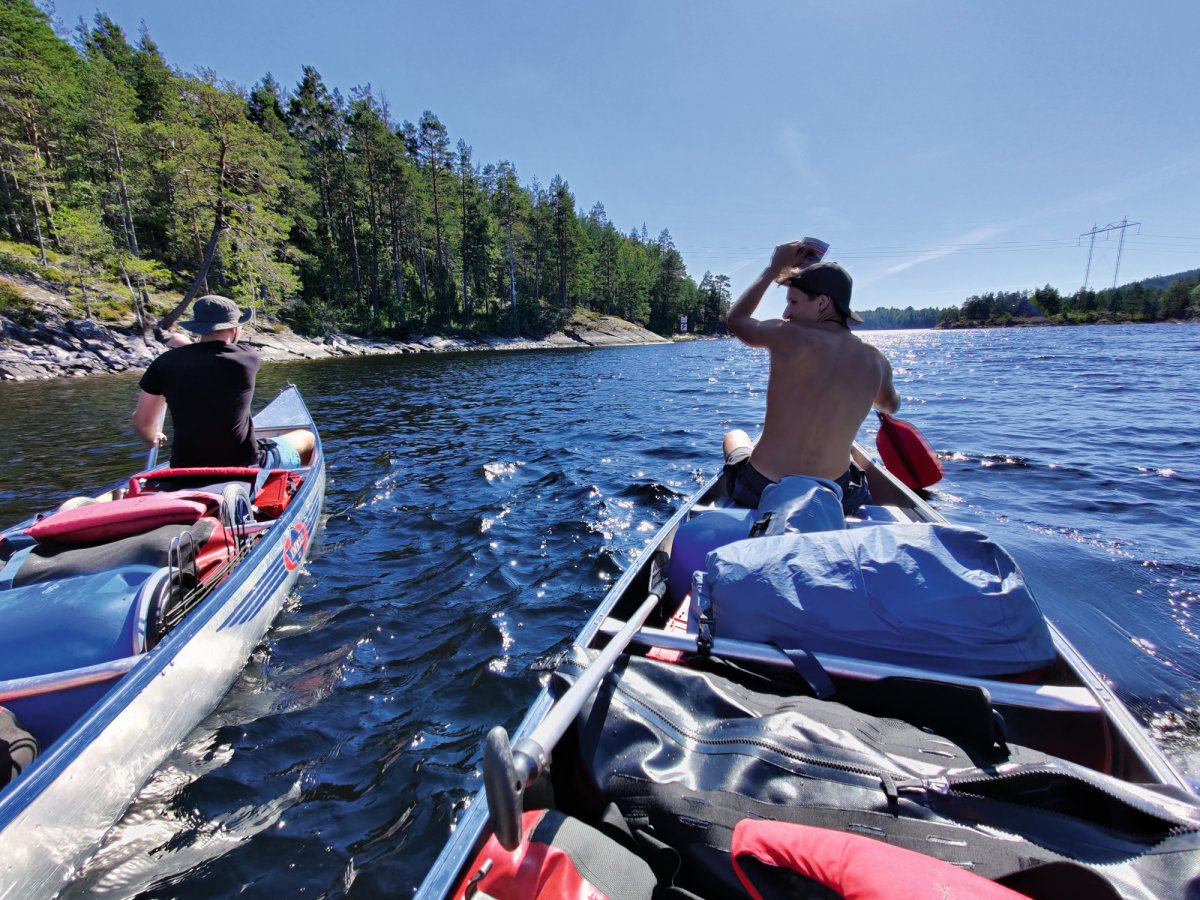 So starteten wir Vier motiviert und voller Elan in unser Abenteuer. Unser erstes Ziel war es Richtung Norden zu fahren um dann weiter westlich über die norwegische Grenze zu kommen. Wir fühlten uns sehr gut und kamen trotz schwer beladenen Kanus gut voran. Den ersten kleinen Snack kombinierten wir mit ein paar kurzen Sprüngen von einem kleinen Stein. Alles lief gut, scheinbar zu gut, denn nach einer guten Strecke auf den Kanus fiel Rik auf, dass er sein Ladekabel im Auto vergessen hatte. In unserem Jugendlichen Leichtsinn dachten wir nach dem Überfliegen der Karte, dass wir noch etwas weiter fahren und dann ungefähr 4 Kilometer durch den Wald laufen könnten um das Kabel zu holen. Was wir aber nicht beachteten waren die Höhenmeter und das Gestrüpp welches uns nach nicht Ganz der Hälfte der Strecke in die Knie zwang und die tapferen Kämpfer Rik und Lucas mit ein paar Kratzern zur Rückkehr brachte. Während der Wanderung haben Jonas und Markus bereits zu Mittag gegessen, sodass sie bei der Ankunft von Rik und Lucas weiter fuhren konnten - in der Hoffnung noch ein Lager an einem DANO-Platz zu finden. Dies gelang uns leider am ersten Tag nicht mehr, was aber nicht weiter schlimm war, weil wir eine schöne kleine Insel hinter der norwegischen Grenze fanden auf der wir unser Zelt und die Hängematten aufbauten und zu Abend aßen. Nachdem alle satt waren versuchte Lucas noch ein bisschen seine Angel auszuwerfen, wobei nach kurzer Zeit auch dies ein Ende fand, da durch unerklärliche Weise (schlechter Knoten) der Schwimmer mit samt des Köders einen Abgang machte. Somit endete der erste, ereignisreiche Tag unserer Kanutour.