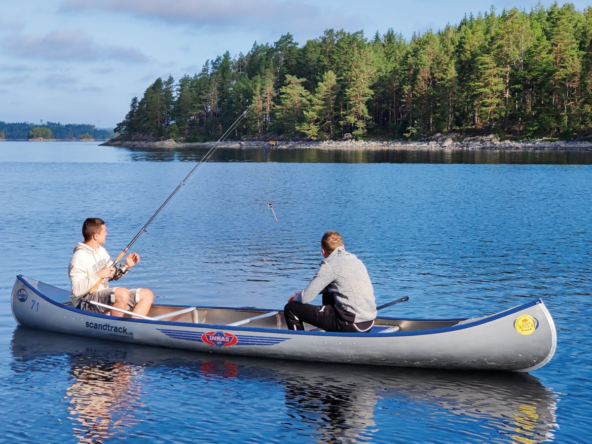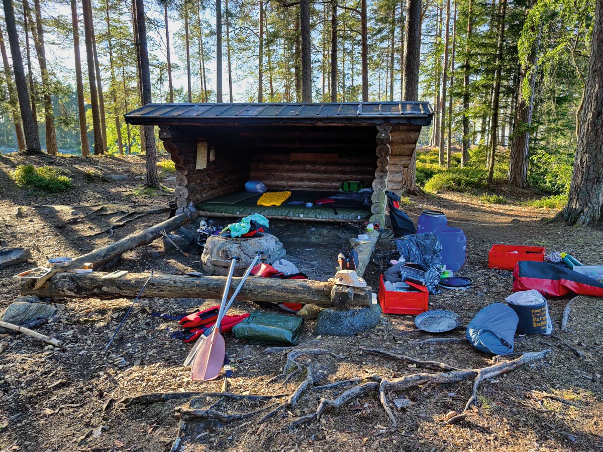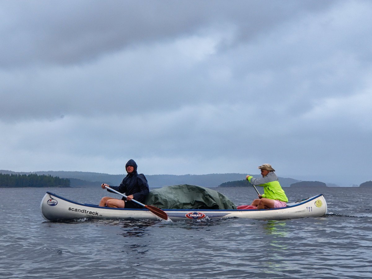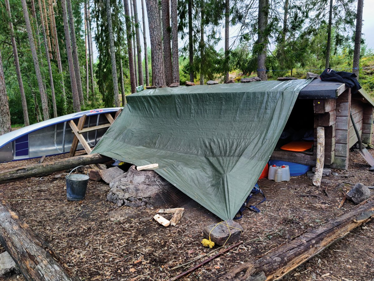 Früh aufstehen und loskommen, das war vermutlich eine der wichtigsten Dinge die wir an den vorherigen Tagen gelernt haben. Deswegen klingelte auch an diesem Morgen unser Wecker um viertel vor 8 und Jonas - der Morgenmensch der Truppe - setzte schon den Kaffee auf um wirklich alle aufwecken zu können. Zum Frühstück gab es zum klassischen Frühstück noch das Heidelbeerbrot welches sehr lecker war. Gesättigt und wach waren wir heute motiviert, die relativ nahe DANO Hütte 12 zu erreichen, da wir immer noch etwas erschöpft waren und die nicht so Paddel-intensiven Tage sehr genossen haben. Bei der Hütte angekommen waren zwar noch Abreisende Kanufahrer da. Wir gingen zu ihnen, denn wir hatten gelernt, dass eigentlich alle nett und offen sind und man meistens auch noch etwas lernen kann. Nach einem netten Gespräch und dem Entladen der Boote, starteten wir wieder eine kleine Inselrundtour und kurz darauf zogen Rik und Markus wieder mal los um eine Angeltour zu machen. Diesmal war uns das Anglerglück hold und wir, genauer gesagt Markus, fing seinen ersten Hecht, den Rik dann waidgerecht tötete und anschließend sehr gut ausnahm, wenn man betrachtet das es sein erstes Mal war. Wie am vorherigen Tag mussten wir wieder eine Plane spannen, da es kurz regnete. Während der Regenpause machten wir uns Nudeln mit Tomatensauce und spielten noch Karten. Als es dann langsam Zeit für das Abendessen war schauten wir im Rezeptbuch nach einer Fischzubereitung und entschieden uns dazu, dass Fischfilet wie beschrieben mit Mehl und Zitronensaft zu machen. Dazu gab es Bratkartoffeln. Vor dem Schlafen gehen, legten wir die Plane noch auf das Windschutzhüttendach falls es regnen sollte.