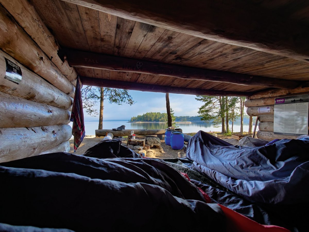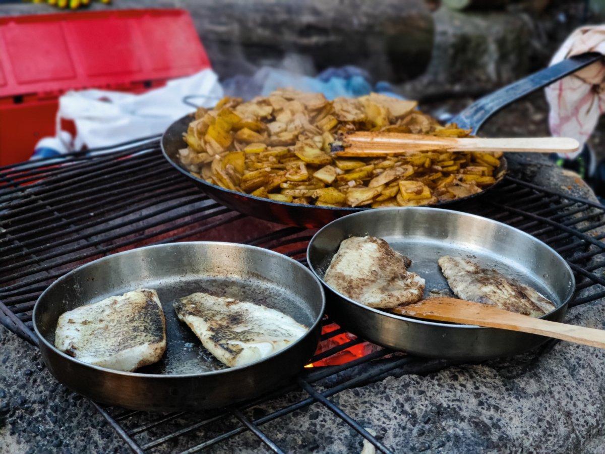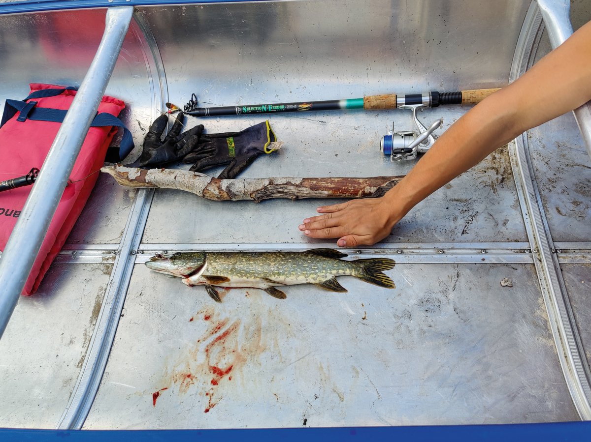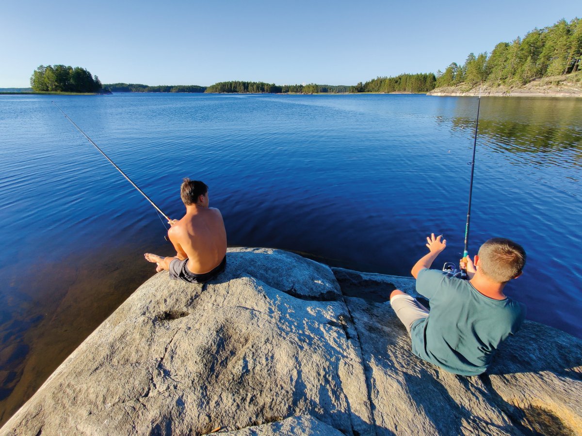 Früh aufstehen und loskommen, das war vermutlich eine der wichtigsten Dinge die wir an den vorherigen Tagen gelernt haben. Deswegen klingelte auch an diesem Morgen unser Wecker um viertel vor 8 und Jonas - der Morgenmensch der Truppe - setzte schon den Kaffee auf um wirklich alle aufwecken zu können. Zum Frühstück gab es zum klassischen Frühstück noch das Heidelbeerbrot welches sehr lecker war. Gesättigt und wach waren wir heute motiviert, die relativ nahe DANO Hütte 12 zu erreichen, da wir immer noch etwas erschöpft waren und die nicht so Paddel-intensiven Tage sehr genossen haben. Bei der Hütte angekommen waren zwar noch Abreisende Kanufahrer da. Wir gingen zu ihnen, denn wir hatten gelernt, dass eigentlich alle nett und offen sind und man meistens auch noch etwas lernen kann. Nach einem netten Gespräch und dem Entladen der Boote, starteten wir wieder eine kleine Inselrundtour und kurz darauf zogen Rik und Markus wieder mal los um eine Angeltour zu machen. Diesmal war uns das Anglerglück hold und wir, genauer gesagt Markus, fing seinen ersten Hecht, den Rik dann waidgerecht tötete und anschließend sehr gut ausnahm, wenn man betrachtet das es sein erstes Mal war. Wie am vorherigen Tag mussten wir wieder eine Plane spannen, da es kurz regnete. Während der Regenpause machten wir uns Nudeln mit Tomatensauce und spielten noch Karten. Als es dann langsam Zeit für das Abendessen war schauten wir im Rezeptbuch nach einer Fischzubereitung und entschieden uns dazu, dass Fischfilet wie beschrieben mit Mehl und Zitronensaft zu machen. Dazu gab es Bratkartoffeln. Vor dem Schlafen gehen, legten wir die Plane noch auf das Windschutzhüttendach falls es regnen sollte.