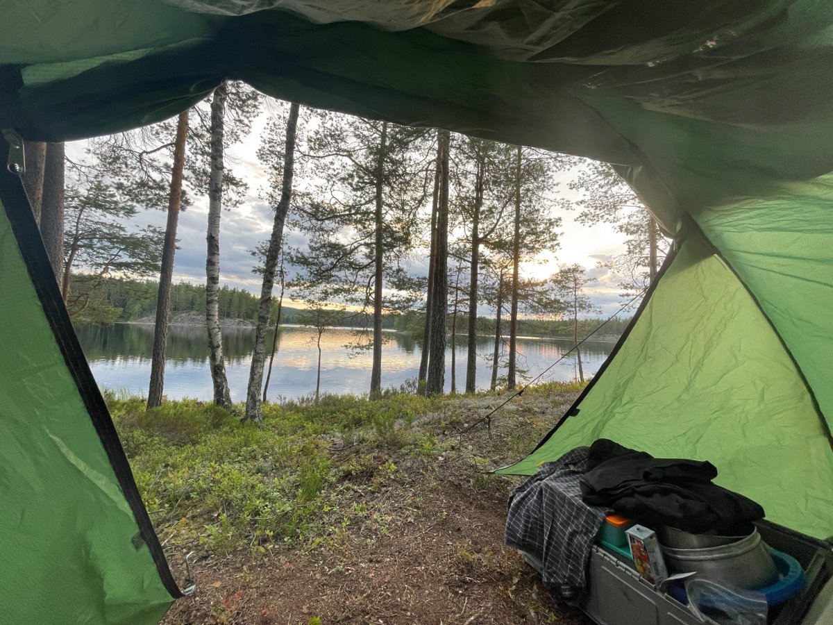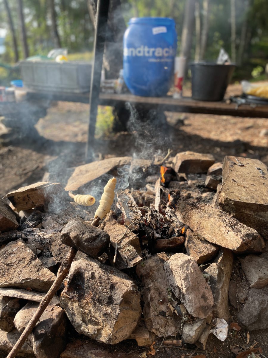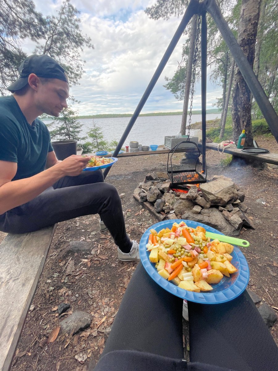 Da wir uns nach einer Nacht noch nicht vom DANO Nr. 12 trennen konnten, war am nächsten Tag eine größere Paddelstrecke nötig. Mit geschmierten Broten machten wir uns auf den Weg von DANO Nr. 12 in Richtung Ausgangspunkt im Norden vom Övre Gla (Entfernung ca. 10 km Luftlinie). Kurz vor dem Ziel trafen wir auf eine mit uns gestartete Gruppe, sodass wir uns kurzerhand entschieden, bei ihnen unser Zelt aufzubauen und uns das Camp zu teilen. Gemeinsam verbrachten wir einen geselligen Abend vor dem Lagerfeuer und aßen reichlich Stockbrot.