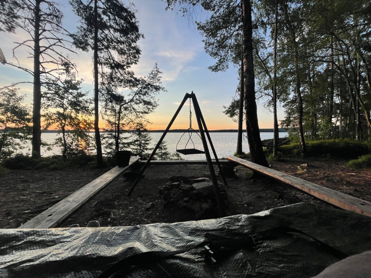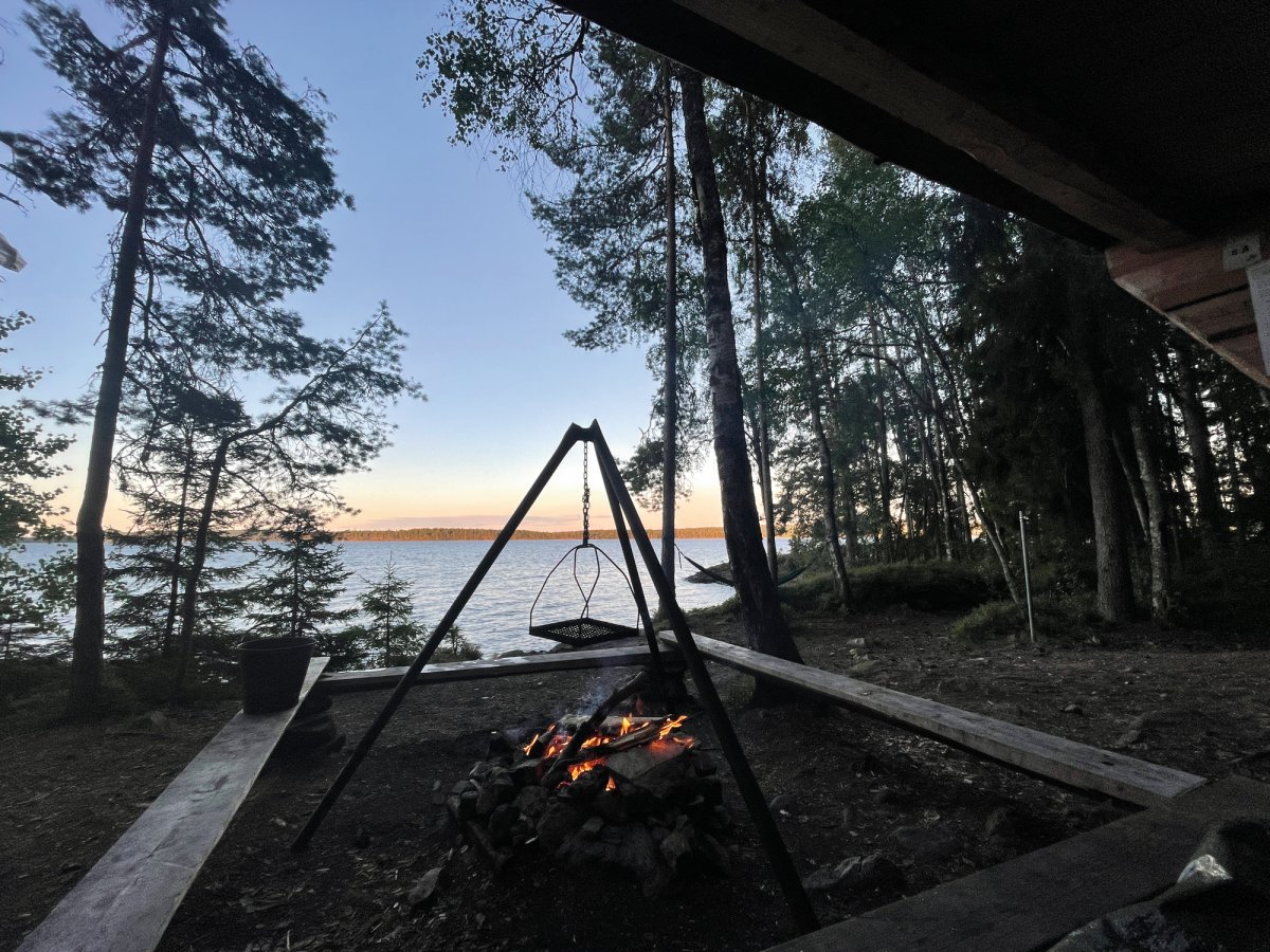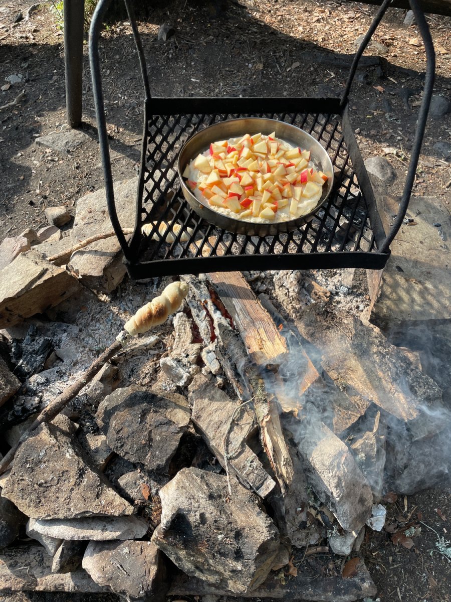 Da wir uns nach einer Nacht noch nicht vom DANO Nr. 12 trennen konnten, war am nächsten Tag eine größere Paddelstrecke nötig. Mit geschmierten Broten machten wir uns auf den Weg von DANO Nr. 12 in Richtung Ausgangspunkt im Norden vom Övre Gla (Entfernung ca. 10 km Luftlinie). Kurz vor dem Ziel trafen wir auf eine mit uns gestartete Gruppe, sodass wir uns kurzerhand entschieden, bei ihnen unser Zelt aufzubauen und uns das Camp zu teilen. Gemeinsam verbrachten wir einen geselligen Abend vor dem Lagerfeuer und aßen reichlich Stockbrot.