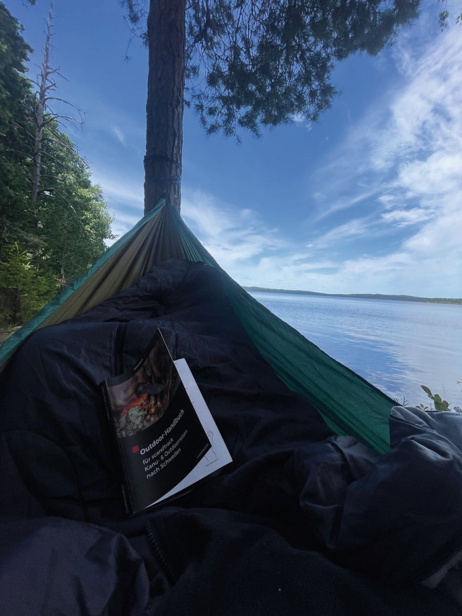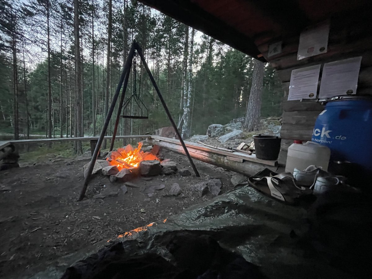 Mit nun ausreichend Sonnencreme bewaffnet beendeten wir die erste Fußetappe und setzten in den Stora Gla über. Größerer See, mehr Wind und noch beeindruckender als der Övre Gla. Unser Ziel war es heute, eine der begehrten Windschutzhütten zu ergattern. Auch hier ging es mit einem kurzen Badestop weiter die Westküste entlang, bis zum DANO Nr. 8. Wir richteten uns ein, machten ein Feuer, suchten einen geeigneten Platz für unsere Hängematte und verweilten gleich zwei Nächte an diesem wunderschönen Ort. Den paddelfreien Tag nutzten wir zum Blaubeeren sammeln und testen einige Rezepte wie z.B den Apfelkuchen sowie das eigene Stockbrot aus dem Outdoor-Kochbuch von scandtrack. Vielleicht habt ihr selbst schonmal eine Nacht unter freiem Himmel verbracht oder werdet selber mal eine Nacht in einem DANO verbringen – Die Erfahrung ist abenteuerlich und die erste Nacht war wirklich aufregend. Probiert es doch einfach mal aus…