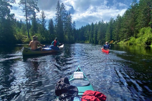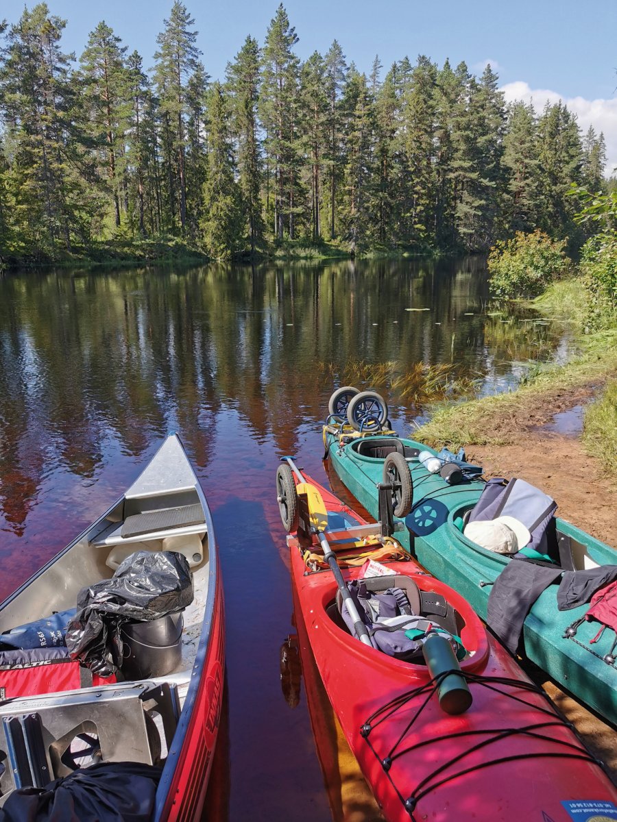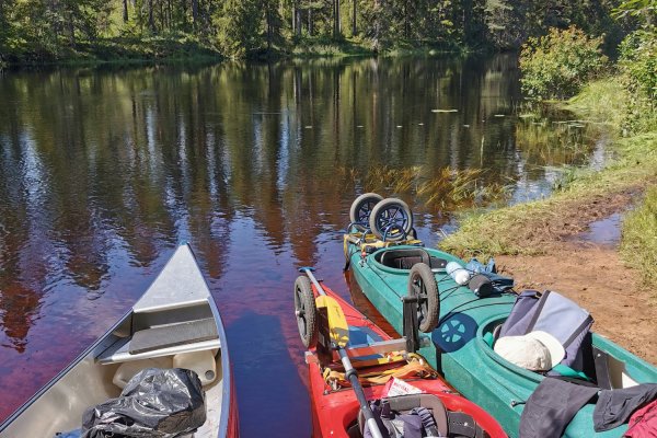 Wir beschlossen am nächsten Morgen mit einem Mietauto nach Schweden weiterzufahren und kamen Nachts in unserem Camp in Halleförs an. Nach einigen wenigen Stunden Schlaf bekamen wir früh morgens unsere Kanueinweisung und verstauten unser mitgebrachtes Gepäck in unseren Booten. Trotz großen Befürchtungen, dass unser Gepäck nicht auf die Kanus und Kajaks passte, bekamen wir nach einigem Hin und Her alles unter. Nach einer kurzen Fahrt mit dem Auto wurden wir an den Ausgangspunkt unserer Reise gebracht.