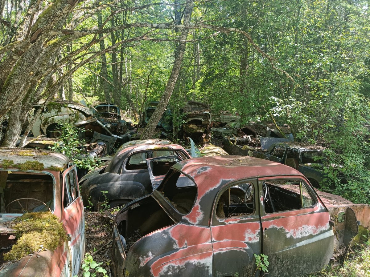 Am Tag vier ist es soweit: das Kanu ist mit Zelt, Ausrüstung und Essen vollgepackt und dann geht die große Tour los. Das Ziel: Norwegen. Zugegeben, das klingt sehr viel weiter als es ist. Einen Abstecher machen wir noch zum Autofriedhof von Båstnäs. Hier liegen hunderte alte Autos mitten im Wald, verrostet und überwuchert. Mal wieder etwas gruselig und spannend zugleich. Gruselig und spannend ist dann auch das letzte Stück Weg zur Insel Trolløya, über die die schwedisch-norwegische Grenze verläuft. Wind und Wellen bringen uns fast dazu, unser Vorhaben aufzugeben, aber die Sturheit und der Wunsch, hinterher erzählen zu können, dass wir bis nach Norwegen gepaddelt sind, sind stärker. Auf der Insel angekommen, stellen wir fest, dass die norwegische Seite nicht wirklich anders aussieht als die schwedische. Keine Berge, Fjorde und Trolle in Sicht. Schade. Für die Übernachtung suchen wir uns eine Bucht nicht weit von der Insel entfernt. Der Platz ist perfekt, wunderschöne Natur, wo man auch hinschaut, und keine weitere Menschenseele in Sicht. Und einen herrlichen Sonnenaufgang am nächsten Morgen.