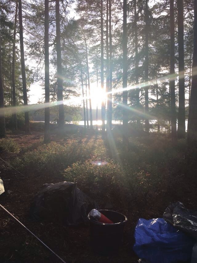 Es war langsam Mittag und wir mussten uns Gedanken machen wo wir die letzte Nacht übernachten wollten. Wieder am Steg angekommen trafen wir auch andere Kanufahrer mit denen wir uns kurz unterhalten haben. Sie sagten uns dass unser eigentlicher Plan, auf die Insel mit den vier Danos zu fahren, nicht gut sei. Sie sei gestern schon ziemlich voll gewesen, somit mussten wir spontan einen neuen Plan machen. Wir entschieden uns weiter Richtung Süden zu fahren, nur nicht zu weit, da wir das Wetter nicht unterschätzen wurden. Somit nahmen wir unser Kanu und paddelten weiter, bis wir an der Insel neben Dano 10. Dort waren, wie wir vermuteten, auch schon andere Kanufahrer, dennoch sahen wir einen freien Platz und legten an dem Ufer an. Schnell trugen wir unsere Sachen hoch, bauten unser Zelt auf und stiegen wieder in das Kanu. Es war noch zu früh um bereits etwas zu essen oder am Land zu bleiben somit fuhren wir noch eine Runde um die Inseln, ehe wir uns wieder auf dem Weg „nach Hause“ machten und anfingen Mittagessen zu kochen.