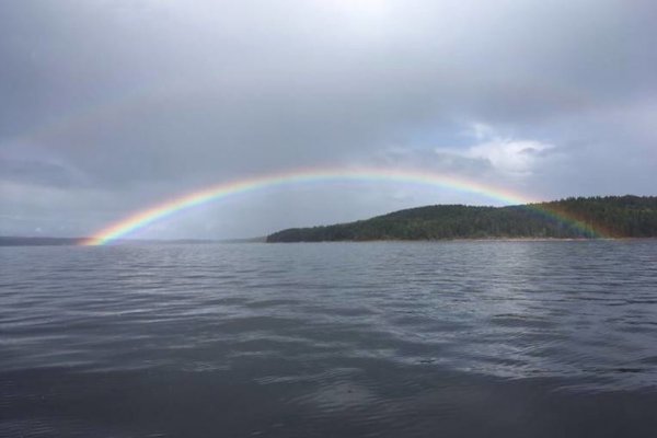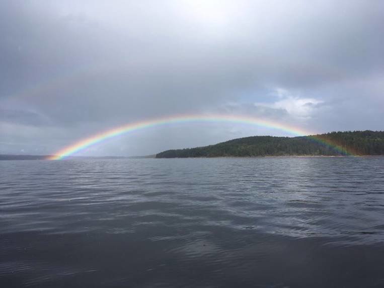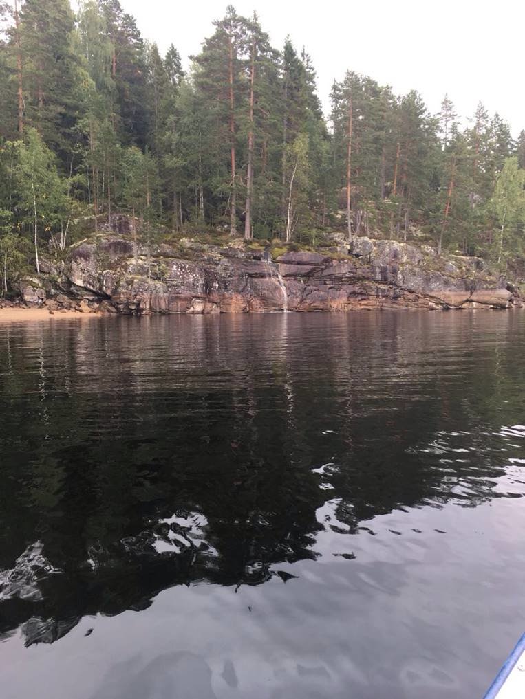 Der Wasserfall war durch den andauernden Regen größer geworden und nun konnte man ihn deutlich sehen und auch hören. Schon wieder waren wir begeistert von seiner Schönheit und entschlossen die Insel hier zu erkunden, in der Hoffnung dass man sein Zelt aufschlagen konnte. Leider hatte unsere Suche nach einem Zeltplatz kein glück. Bäume und eine steile Klippe machten es uns nicht möglich hier unser Zelt auf zu stellen. Wir sahen uns an, somit mussten wir wieder raus, wieder gegen die Wellen kämpfen und wieder weiter fahren. Unsere Kräfte würden nicht lange halten, dessen waren wir uns bewusst doch wir mussten versuchen alles zu geben und so machten wir uns wieder auf den Weg. Es ging wieder auf den See, wir hielten uns wie gewohnt an Ufernähe auf und paddelten. Ich weiß dass wir an diesem Tag alles gegeben habe und ich bin stolz auf meinen Partner und auf mich dass wir diesen Tag bewältigt haben.