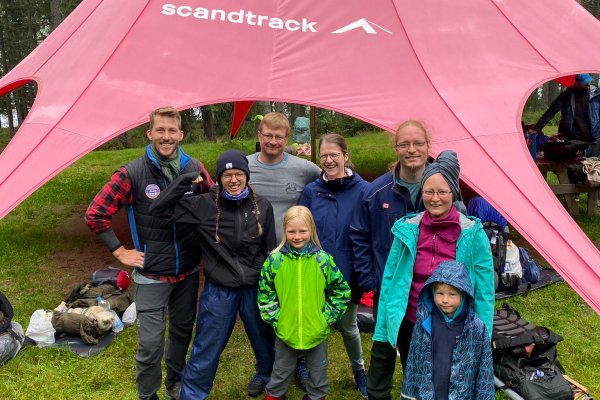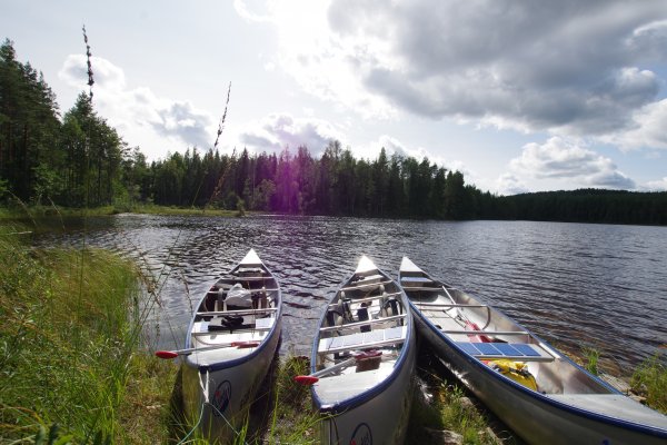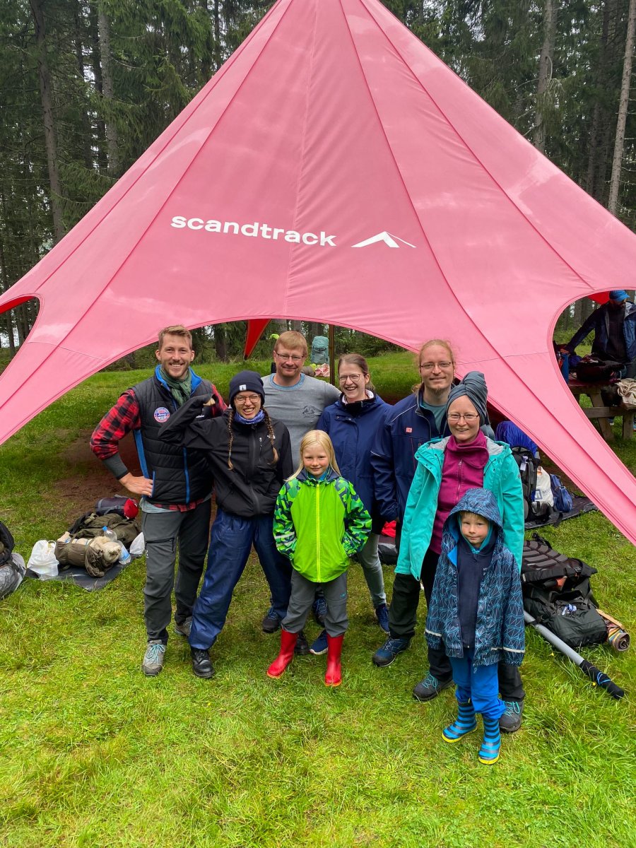 Wir, das sind Lena 10 Jahre, Jacob 6 Jahre, die Eltern Sonja und Michael, sowie Martin und Kerstin und Sonja und Moritz. Nach einem leckeren Essen, das letzte was nicht auf dem Feuer gekocht wird, machen wir uns auf den Weg zum Hamburger ZOB wo bereits eine große Gruppe junger WWFler, sowie weitere Abenteurer auf die Abfahrt des Scandtrack-Shuttles warteten. Mit etwas Verspätung trifft dieser auch ein. Wir freuen uns sehr über die Sitzplatzauswahl, ganz vorne mit bester Aussicht und Beinfreiheit, was bei 12 Stunden Busfahrt echt schön ist. Trotz etwas lauter Hintersitzer schlafen zumindest die Kinder sofort ein und müssen auf den Fähren aus dem Bus getragen werden. Etwas müde und zerschlagen kommen wir im Basiscamp Höglund an, achja stimmt, hier war das also, so wir bereits vor ca. 15 Jahren das erste Mal Kanutour auf eigene Faust gemacht haben. Aber diesmal geht es noch weiter. So heißt es warten und Kekse essen bis unser Bus nach Glaskogen abfährt, wo uns Arne, einer der Scandys nett in Empfang nimmt. Unser Plan nur drei Boote zu nehmen und die Kinder jeweils in die Mitte zu setzen, klappte leider aus Platzmangel nicht. So werden nach viel Hin und Her doch vier Boote beladen und zu Wasser gelassen. Mit etwas Gegenwind war das Vorankommen am ersten Paddeltag sehr anstrengend, vor allem für die Boote mit Kind, weil das heißt, der Hintermann muss lenken und den Anschub leisten. (Am Schluss unserer Reise kommen wir auf die schlaue Idee ein Kanu als Gepäck-Anhänger zu nehmen, so dass wir doch zwei dreier-Boote machen können, das geht gleich viel besser.)